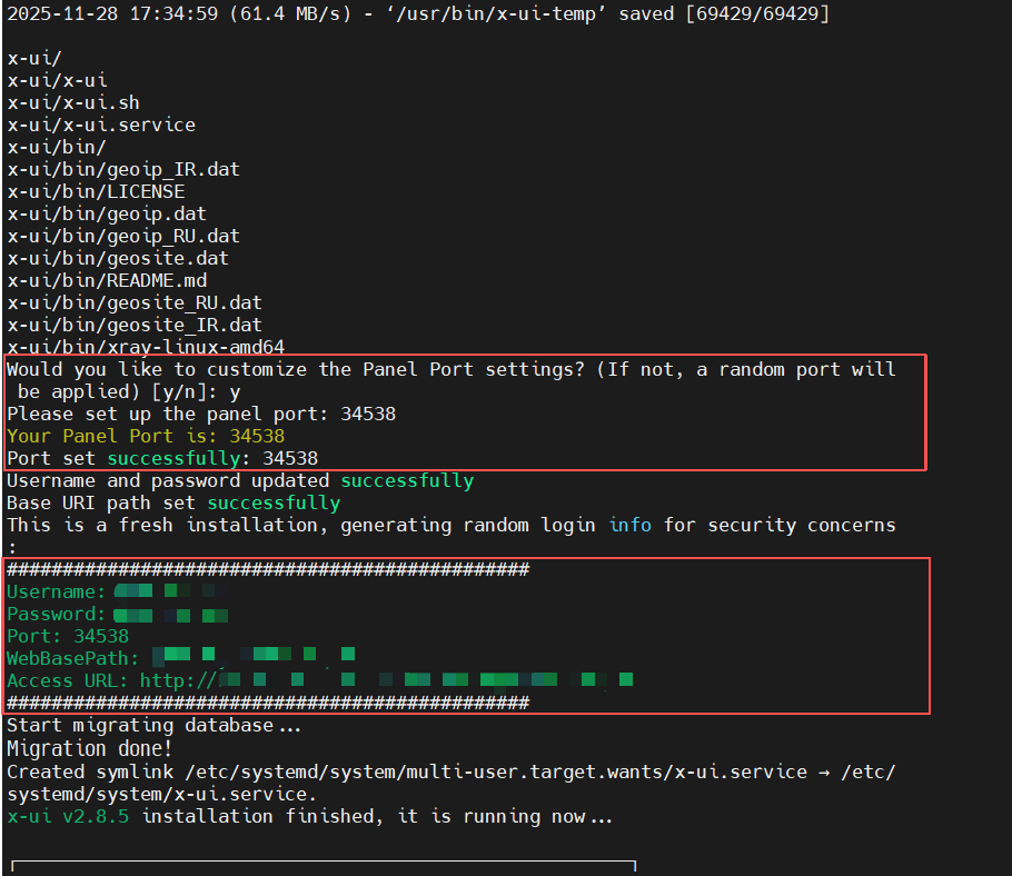 安装结果:完成后会显示面板URL、端口、用户名和密码