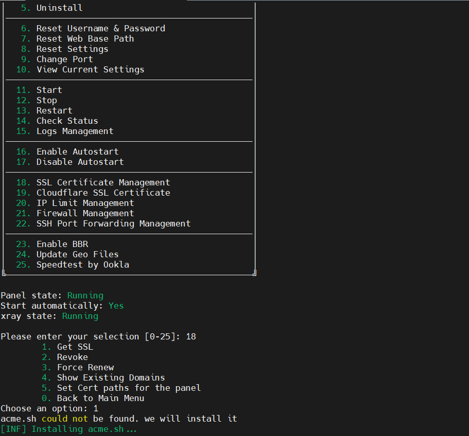 3x-ui的管理面板:输入” x-ui ” 然后回车,输入数字 “18” SSL 证书管理,接下来输入“1” 开始申请证书,如图: