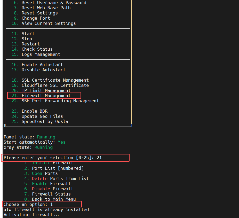 4、可通过此脚本的第【21】选项去安装防火墙进行管理,如下图: