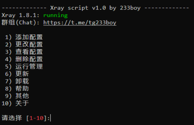 安装完成后,输入 xray 就能看到管理面板,如下图片所示